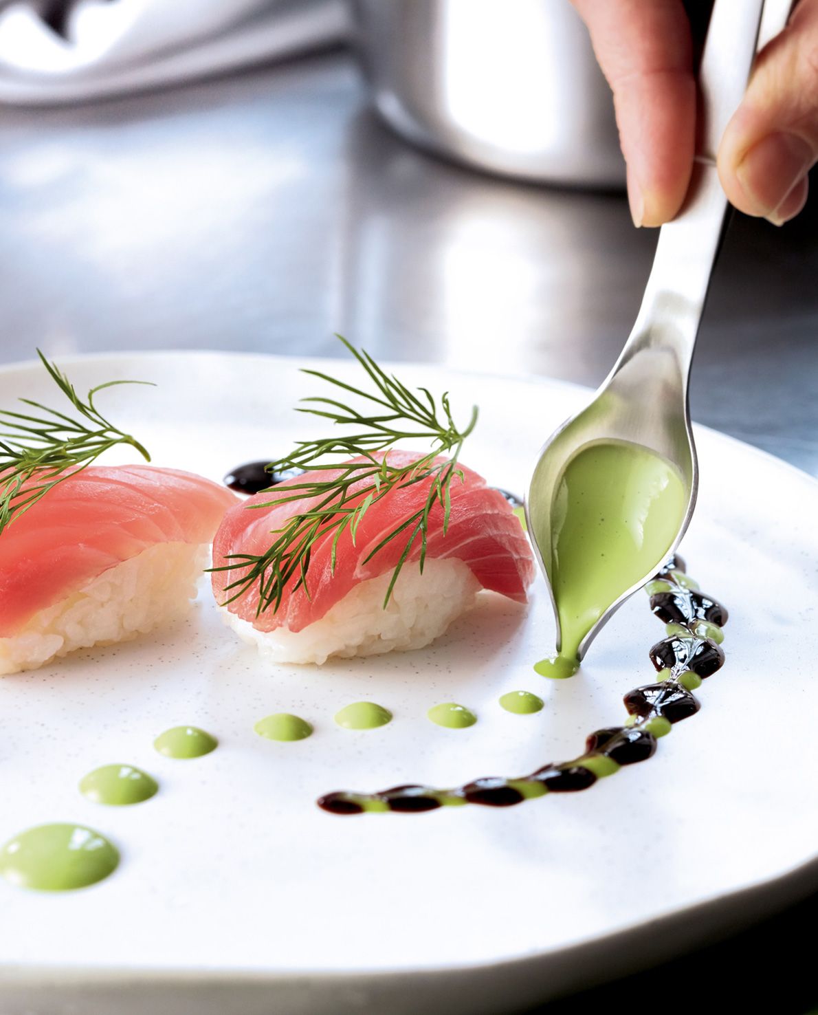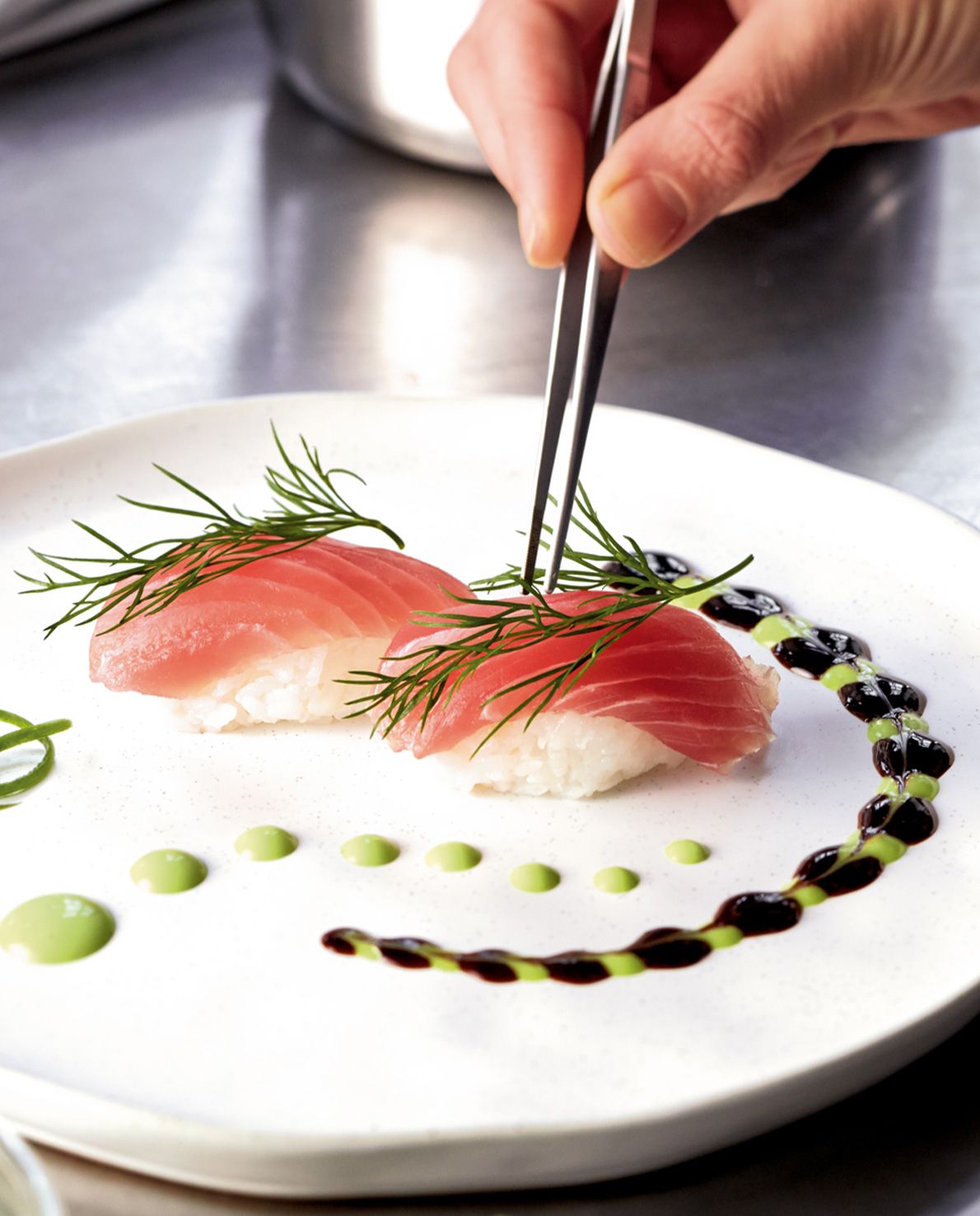 The specially shaped spoon makes it easy to apply sauces and other liquid ingredients in exact patterns. The tweezer side ensures precise placement of herbs, berries, or other small garnishes without crushing or damaging them.